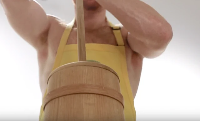 Lábai között állt egy régi vágású, vajat köpül, egy kezelni, hogy stroke, agyvérzés, stroke, amíg az a tejtermék elérte befejezését.